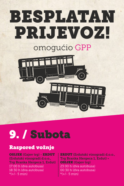 Posjetitelje očekuje koncert u vinogradu Erdutske vinarije – VLATKO STEFANOVSKI TRIO, a Gradski prijevoz putnika omogućio nam je organizirati BESPLATAN PRIJEVOZ AUTOBUSOM do Erdutskih vinograda na koncert.